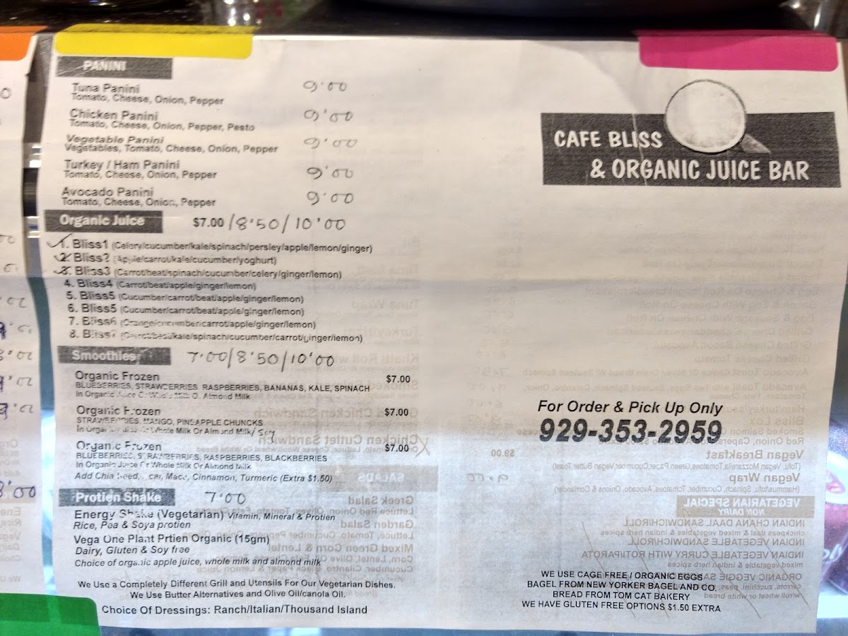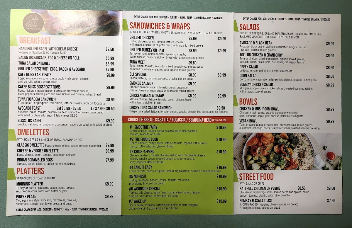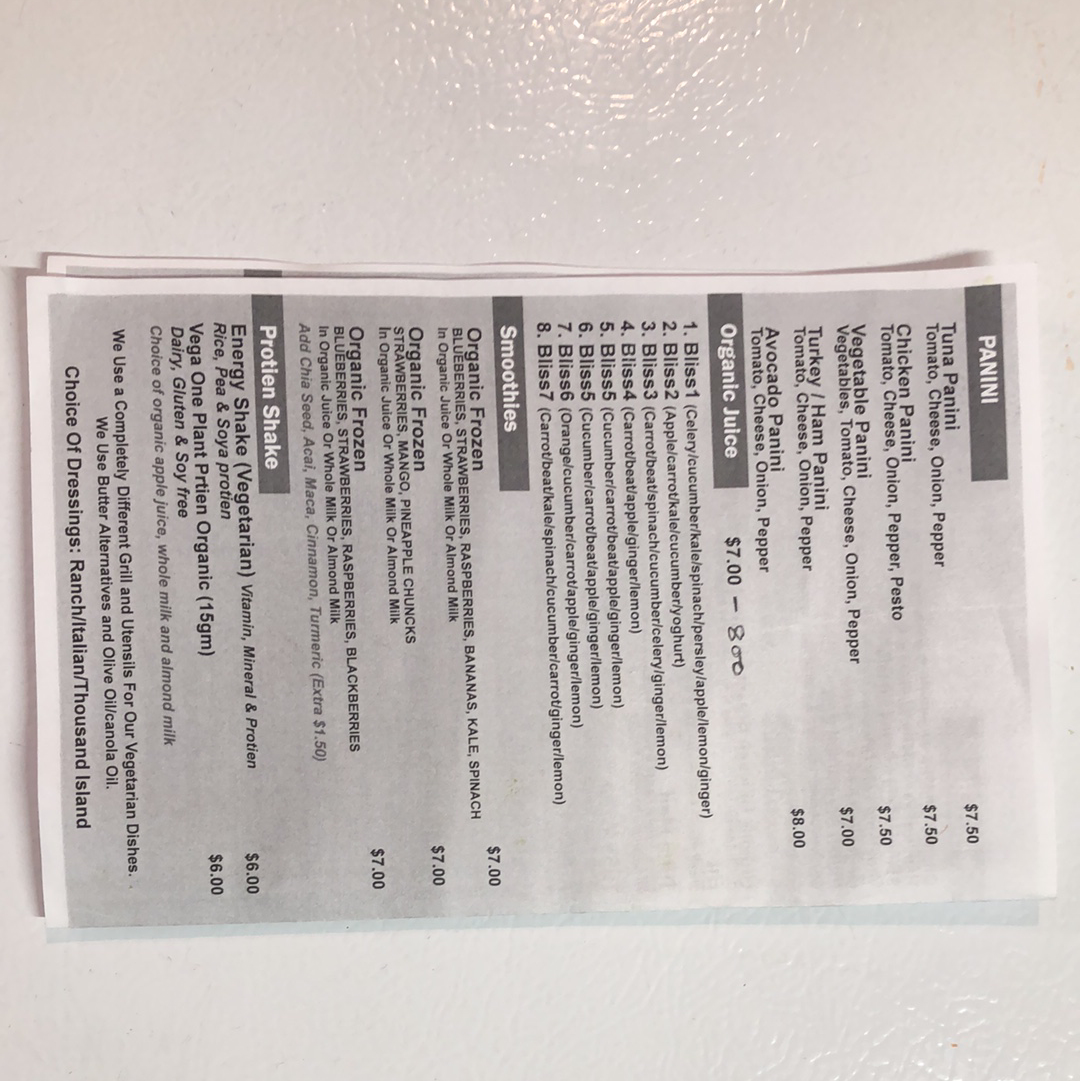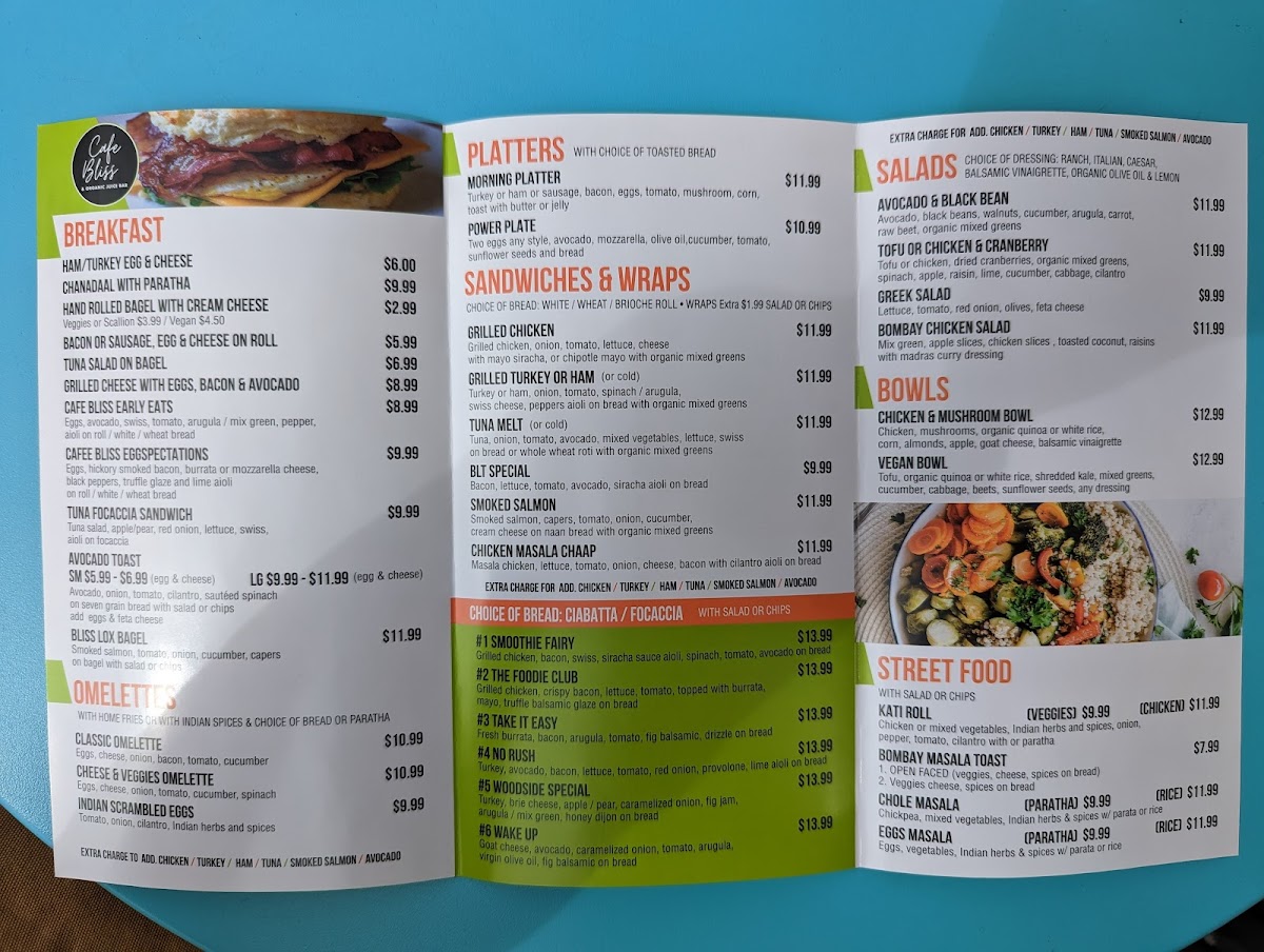 From a reviewer’s perspective, the menu at Cafe Bliss And Organic Juice Bar offers a well-rounded mix of health-focused options and hearty comfort foods, making it easy to find something satisfying at any time of day. The smoothie selection, including Rain Forest Party, Autumn Breeze, and Caribbean Slush Oatmeal Swirl, pairs nicely with refreshing juices like Sunshine and Pure Celery, while the Blended Happiness Set Up and Hawthorne add variety for juice lovers. For more filling meals, the Basmati Rice, Masala Chicken, and Masala Paneer Matar from the Cafe Bliss Special section stand out as flavorful highlights. Breakfast options such as Egg And Cheese On Roll, Cafee Bliss Eggspectations, and Large Avocado Toast cater to both classic and health-conscious tastes. The menu also shines with diverse bowls like the Vegan Bowl and Chicken And Mushroom Bowl, alongside lighter choices like the Tofu Or Chicken And Cranberry Salad and Avocado And Black Bean Salad. Unique additions such as wellness shots-Turmeric Shot and Ginger Lemon Shot-and street food items like Kati Roll and Bombay Masala Toast add an exciting twist. Overall, the variety-from Tofu Scramble and Classic Omelette to sandwiches like Smoked Salmon and Chicken Masala Chaap-creates a menu that feels both eclectic and thoughtfully curated, even though pricing details are not specified.