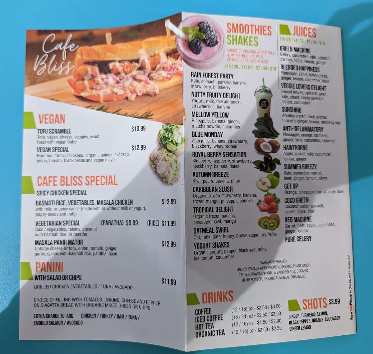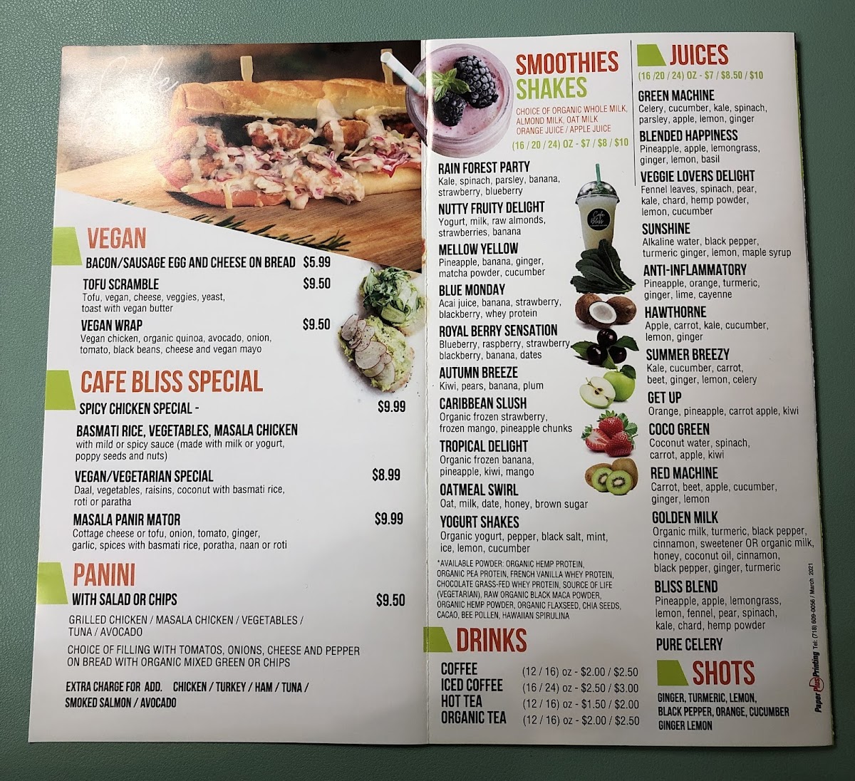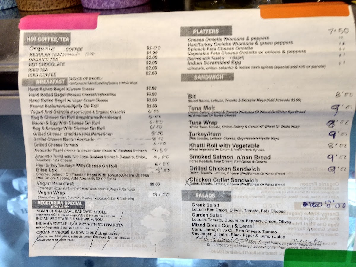 From a reviewer’s perspective, the menu at Cafe Bliss And Organic Juice Bar offers a well-rounded mix of health-focused options and hearty comfort foods, making it easy to find something satisfying at any time of day. The smoothie selection, including Rain Forest Party, Autumn Breeze, and Caribbean Slush Oatmeal Swirl, pairs nicely with refreshing juices like Sunshine and Pure Celery, while the Blended Happiness Set Up and Hawthorne add variety for juice lovers. For more filling meals, the Basmati Rice, Masala Chicken, and Masala Paneer Matar from the Cafe Bliss Special section stand out as flavorful highlights. Breakfast options such as Egg And Cheese On Roll, Cafee Bliss Eggspectations, and Large Avocado Toast cater to both classic and health-conscious tastes. The menu also shines with diverse bowls like the Vegan Bowl and Chicken And Mushroom Bowl, alongside lighter choices like the Tofu Or Chicken And Cranberry Salad and Avocado And Black Bean Salad. Unique additions such as wellness shots-Turmeric Shot and Ginger Lemon Shot-and street food items like Kati Roll and Bombay Masala Toast add an exciting twist. Overall, the variety-from Tofu Scramble and Classic Omelette to sandwiches like Smoked Salmon and Chicken Masala Chaap-creates a menu that feels both eclectic and thoughtfully curated, even though pricing details are not specified.